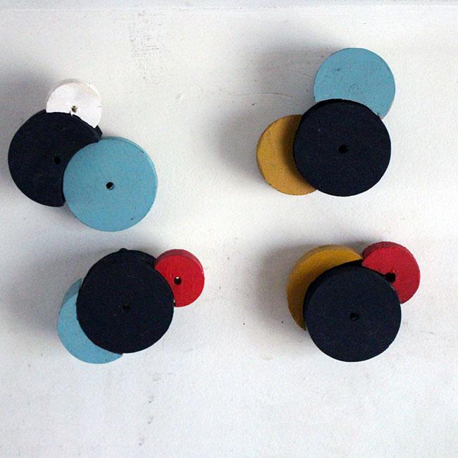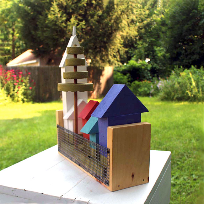 Sue Berg uses reclaimed materials in all her work, it is the bedrock of her practice. The use of recycled materials imbues the work with history, memory, reveals the effects of time on objects, and is a way to take care of the planet. The media theorist, Marshal McLuhan’s famous quote, “the medium is the message”, plays a role. When examining Sue’s art you will find wooden constructions, cut paper, sewn objects, concrete, and functional widgets. But the message is always the same, materials on the planet are finite and artists must make art responsibly. Sue often explores the domestic landscape with the house/home as a repeated shape. Of course, the environment plays a key role and nature often takes center stage. You may also see strict geometric abstraction reflecting Sue’s graphic design background. Through color, pattern, and shape she creates a simplified vision of the world, these are the conceptual underpinnings of her ongoing work. Sue Berg was born in Bamberg, Germany in 1959. She received her MFA in New Media from Maine College of Art in 2001. Currently, Sue lives in Torrington, Connecticut. She is a retired Professor Emeritus of Art after 30 years of service to the students of Connecticut. Resume